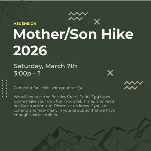 We are in search of someone or a small group to help put together an event for our Mothers and Sons. Ideas are forming, but nothing is set yet. The event is March 7th. If you are interested, please reach out to Sally Merrell (502-881-3995) or Jaclyn Mullin (502-553-9895).